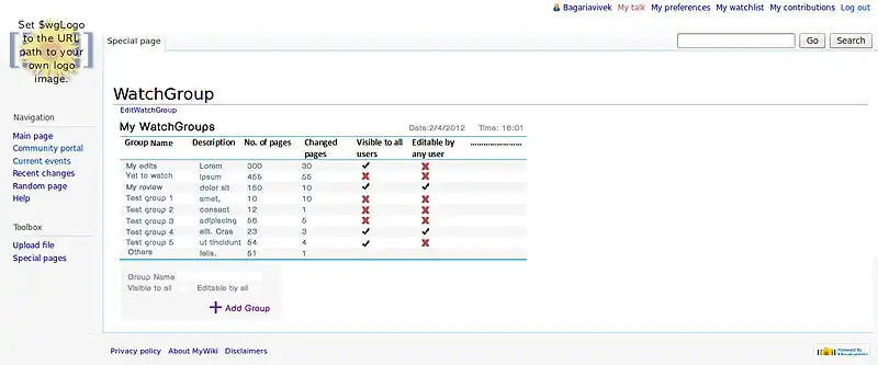 - Add/Remove pages to WatchGroups. For example www.mediawiki.org/w/index.php?action=watchgroup&groupname=MyGroup, will add the page to "My Group".