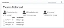We are thinking about this dashboard primarily containing a paginated list of mentees, along with some stats for each mentee. We will want mentors to be able to sort and filter the list, so as to see things like the most active mentees, the least active mentees, the most reverted mentees, etc.