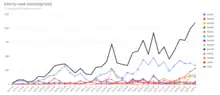 • Similarly to the graph of edits, this number also has increased steadily, and the addition of new wikis (such as French Wikipedia on week 21 and Persian Wikipedia on week 32) are clearly visible.