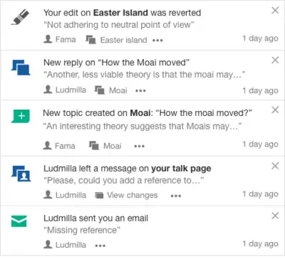 Notifications can surface information excepts to provide more context (the reason for a reverted edit, a piece of a conversation, etc.)