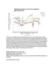 Regular Readership metrics reports were launched by the Wikimedia Foundation's Reading team in September 2015 (initially published weekly), providing a look at some of the most important metrics measuring readership of Wikimedia sites. Their main purpose is to raise awareness about how these metrics are developing, call out the impact of any unusual events in the covered timespan, and facilitate thinking about core metrics in general. The reports have been sent to Mobile-l and some other mailing lists, with PDF copies of past issues and other material from the reports also being available on Commons. Since 2016/17, this topic has been covered in a quarterly presentation on core metrics that grew out of the appendix to the Readers team's quarterly review/quarterly check-in meetings, which is still published on Commons (cf. examples from May 2017 or February 2017) and announced on mailing lists.