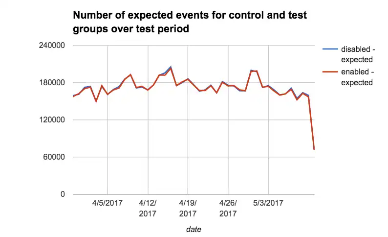 When comparing the ratio of unique events per total events per session for the test and control groups, similar results were observed, with the control group having 0.9986 unique events per session, and the control group having 0.9994 unique events per session. No significant changes to these trends were observed over time.