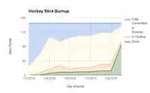 A modification of the Sprint Burndown chart. Instead of showing one line representing the total remaining points to be completed (i.e., Committed - Done), a burnup chart shows completed points over time (Done) with one line and Committed with a separate line. This makes it possible to see which changes in (Committed - Done) are due to changes in each of the two variables separated.